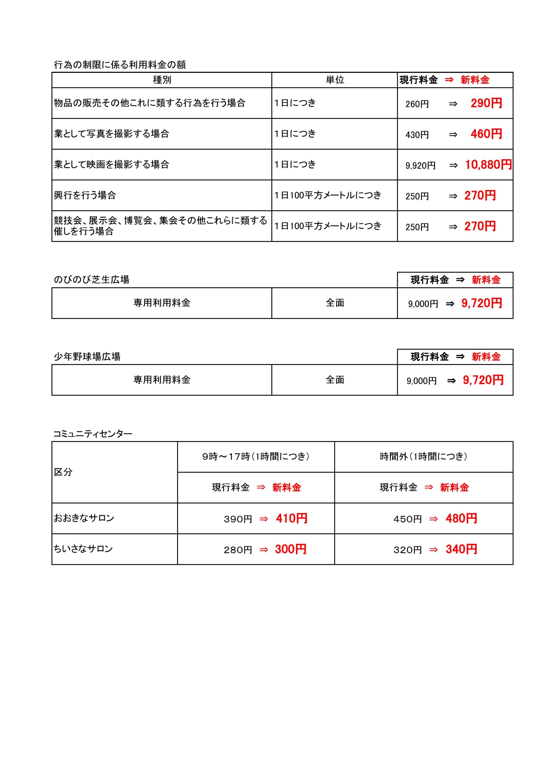 都市公園条例等の改正に伴う利用料金改定について、以下の通りお知らせいたします。