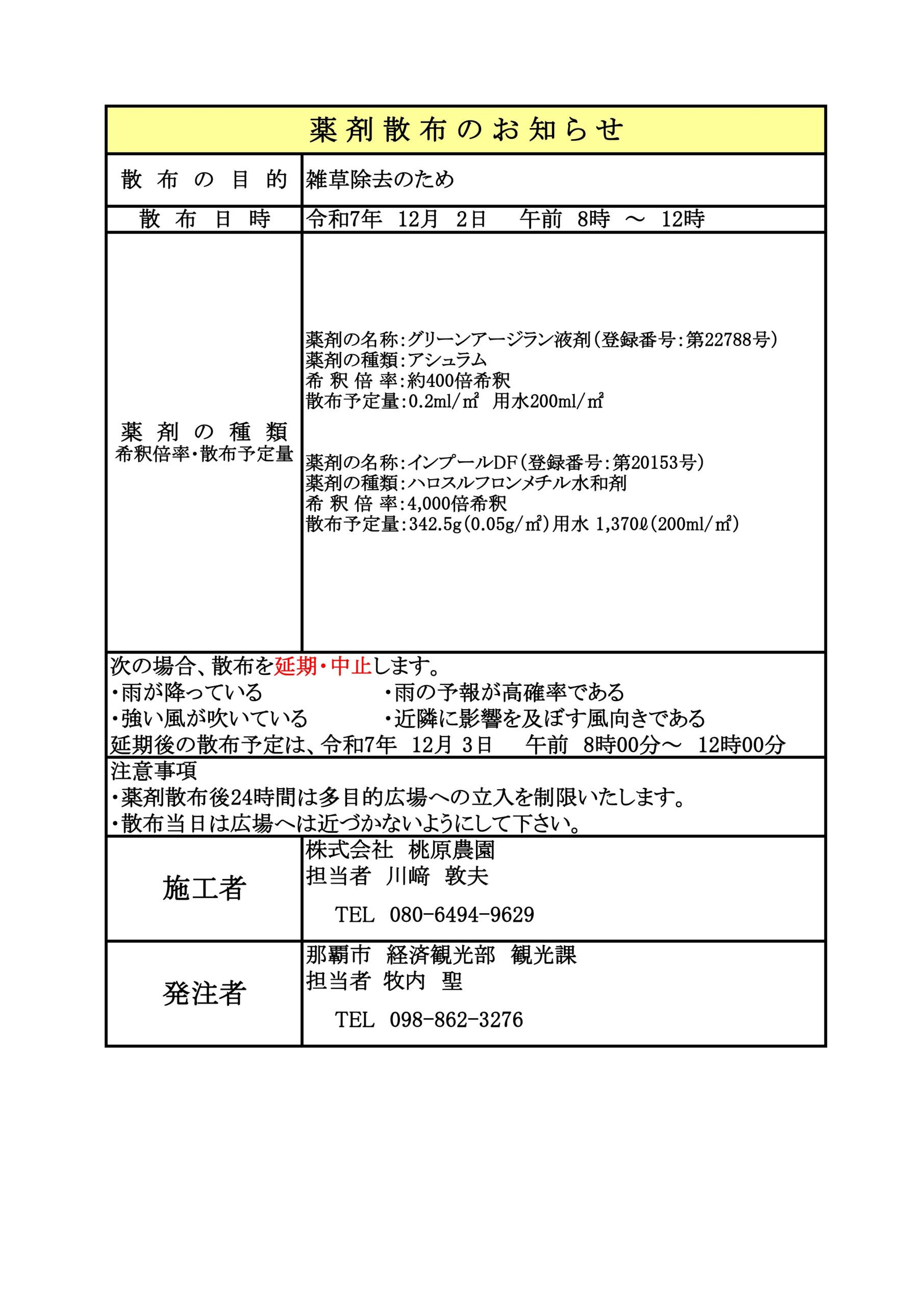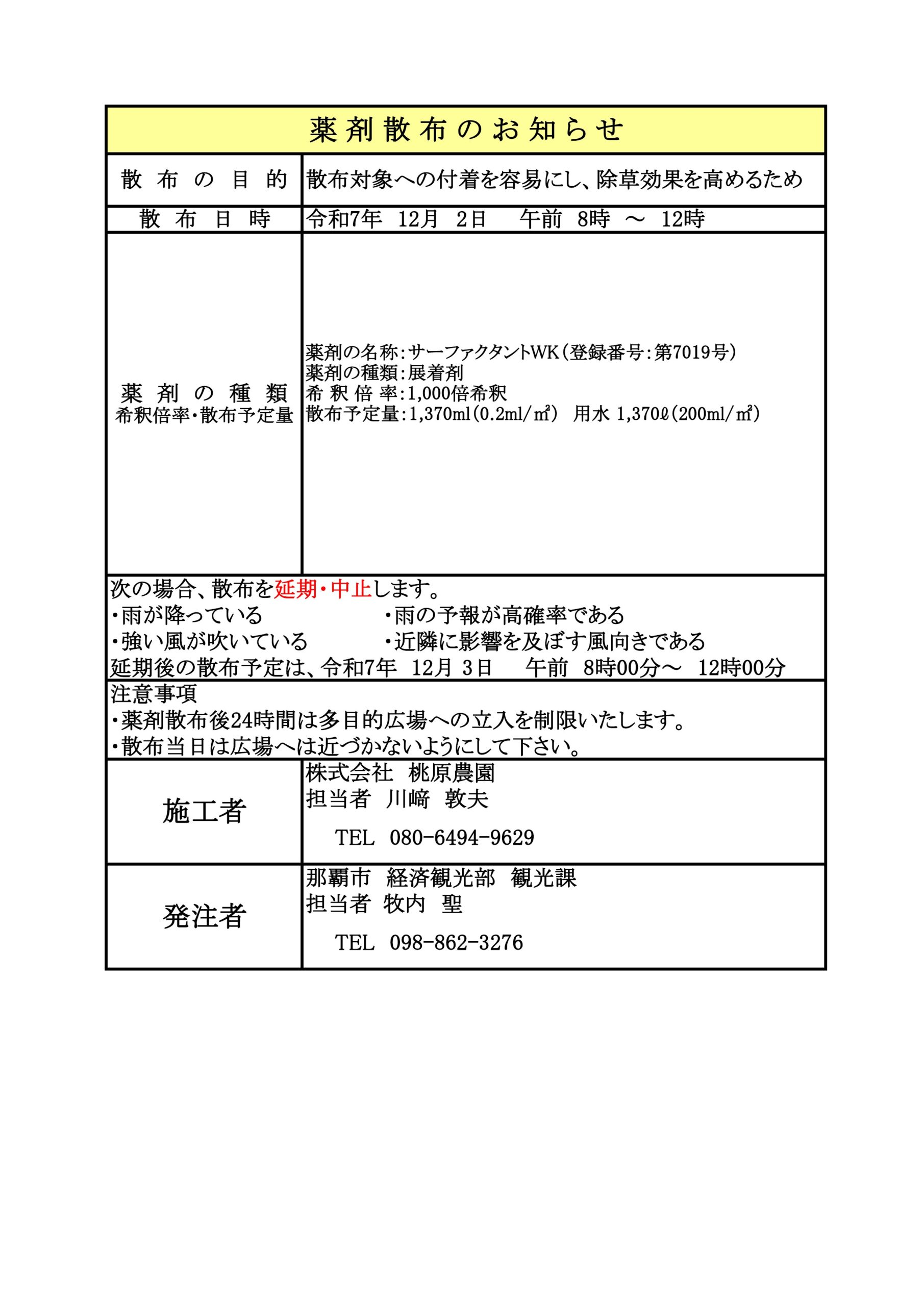 多目的広場薬剤散布作業のお知らせ(施設利用制限) 場所:多目的広場 利用制限:令和7年12月2日8時 ~ 12月3日12時迄(立入禁止) 目的:芝生に悪影響を及ぼす病害の発生予防、雑草除去、雑草の発芽抑制、散布対象への付着を容易にし、防除効果を高めるため