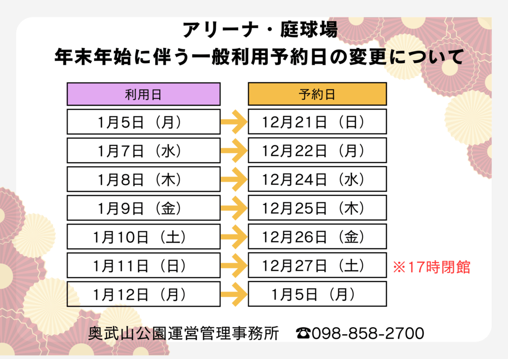 年末年始に伴うアリーナ・庭球場の一般利用予約日変更のお知らせ