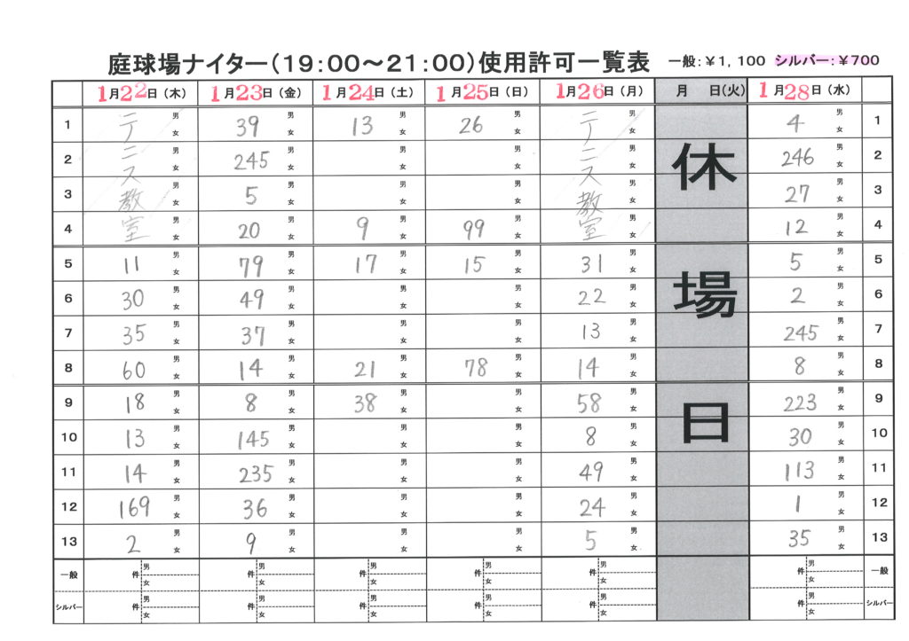 庭球場ナイター利用分抽選結果(1/22~1/28利用分)