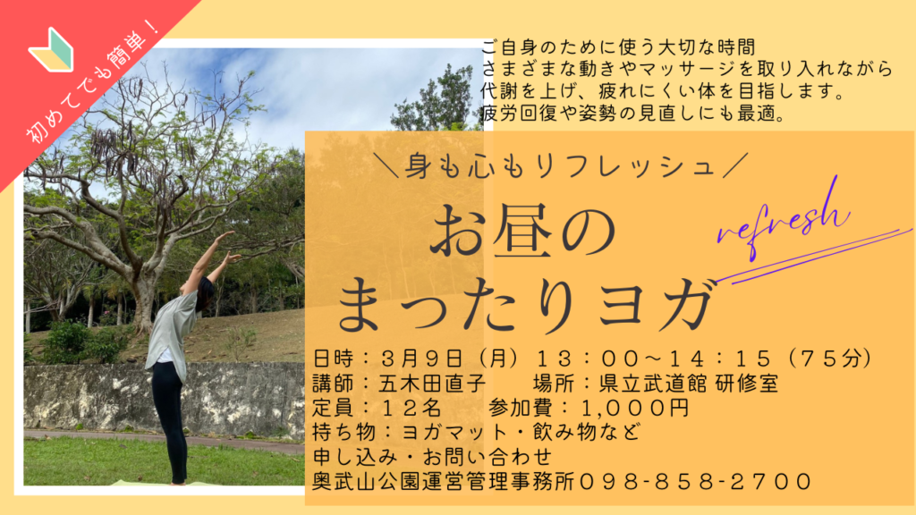 身も心もリフレッシュ♬お昼のまったりヨガ(3月) 大人気講師、五木田直子先生による「身も心もリフレッシュ お昼のまったりヨガ」3月開催致します。 さまざまな動きやマッサージを取り入れながら、代謝を上げ、疲れにくい体を目指します。疲労回復や姿勢の見直しにも最適です。 ・疲労回復 ・リフレッシュ ・集中力向上 ・身も心もすっきりしなやか 家事、育児の隙間時間に、ご自身の為に大切な時間を体験しませんか?