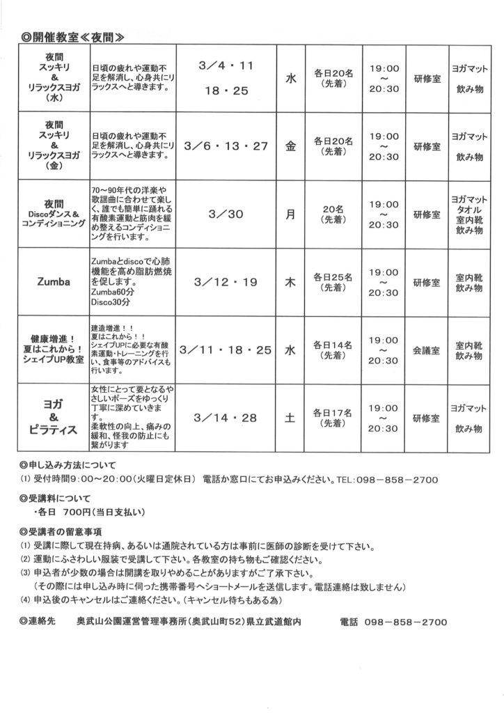3月単発教室のご案内♬ 新年度もいよいよそこまできています!!積極的に動いて、リフレッシュはいかがですか? 定期コースで行っているスポーツ教室の単日開催が決まりました♪ 体験をし、新年度の定期コース申し込みもいかがでしょうか? ZumbaはDiscoとの組み合わせとなりますよ~